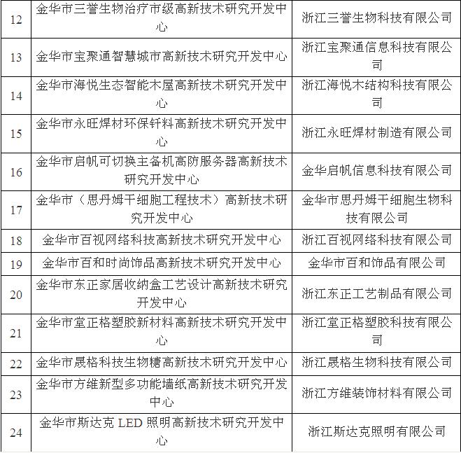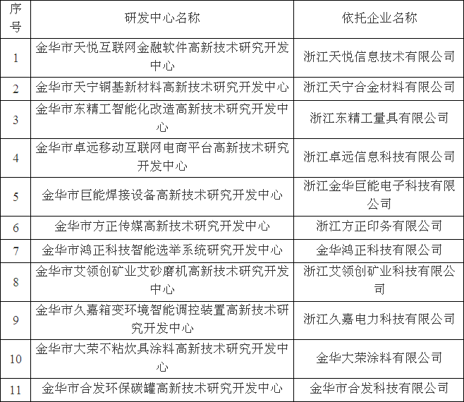 金華市級高新技術(shù)研究開發(fā)中心名單