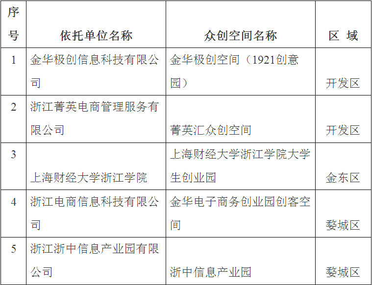 根據(jù)《金華市科學(xué)技術(shù)局關(guān)于印發(fā)金華市眾創(chuàng)空間管理辦法(試行)的通知》(金市科〔2016〕70號),擬認(rèn)定金華極創(chuàng)空間(1921創(chuàng)意園)等7家單位為金華市級眾創(chuàng)空間,現(xiàn)予以公示,接受社會監(jiān)督。如有異議,請來人來電反映,以個人名義反映的,請署真實姓名;以單位反映的,須加蓋單位公章;匿名反映的材料不予受理。公示日期為12月19日至12月26日。