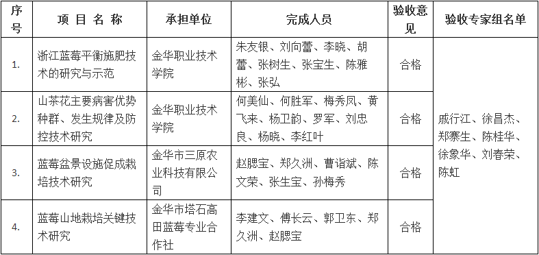 根據(jù)《金華市級科技計劃項目驗收管理辦法》(金市科字〔2015〕83號)規(guī)定,現(xiàn)將金華職業(yè)技術(shù)學院承擔的《浙江藍莓平衡施肥技術(shù)的研究與示范》等市級科技計劃項目驗收結(jié)果予以公示,接受社會監(jiān)督,公示期從2018年7月17日至2018年7月24日止。任何單位和個人對驗收意見持有異議的,應(yīng)當在公示期內(nèi)書面向市科技局提出異議,單位應(yīng)采用書面形式并加蓋公章,個人應(yīng)采用實名提出異議。
