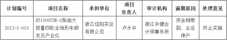 根據(jù)《金華市級科技計(jì)劃項(xiàng)目驗(yàn)收管理辦法》(金市科字〔2015〕83號(hào))相關(guān)規(guī)定,經(jīng)研究,我局?jǐn)M對浙江信陽實(shí)業(yè)有限公司承擔(dān)的市級科技計(jì)劃項(xiàng)目“XY1000CUE-2柴油大排量四輪全地形車研發(fā)及產(chǎn)業(yè)化”(計(jì)劃編號(hào):2013-1-010)進(jìn)行終止處理,對項(xiàng)目負(fù)責(zé)人和主要股東記錄不良科研信用?,F(xiàn)予以公示,自公示之日起5個(gè)工作日內(nèi),有關(guān)單位或個(gè)人如有異議,應(yīng)當(dāng)以實(shí)名與我局聯(lián)系。聯(lián)系方式:金華市科技局工業(yè)與高新技術(shù)處,電話:82469791;市紀(jì)委駐市科技局紀(jì)檢監(jiān)察組,電話:82387952。