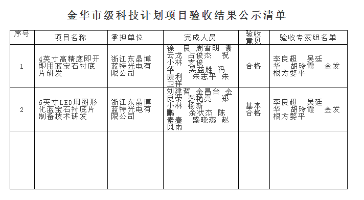 根據(jù)《金華市級科技計劃項目驗收管理辦法》(金市科字〔2015〕83號)規(guī)定,現(xiàn)將浙江東晶博藍特光電有限公司承擔的《4英寸高精度即開即用藍寶石襯底片研發(fā)》和《6英寸LED用圖形化藍寶石襯底片制備技術研發(fā)》2個市級科技計劃項目驗收結果予以公示,接受社會監(jiān)督,公示期從2017年7月31日至8月6日止。任何單位和個人對驗收意見持有異議的,應當在公示期內書面向市科技局提出異議,單位應采用書面形式并加蓋公章,個人應采用實名提出異議。